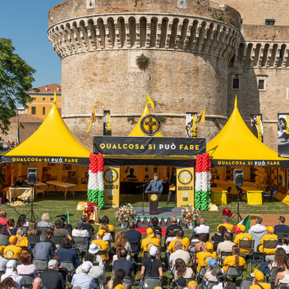 Capping an inspiring presentation on the humanitarian campaigns, Mr. Miscavige reveals new broadcast programming on Scientology Network—igniting a sea of waving flags and cheers across the Grand Marquee.